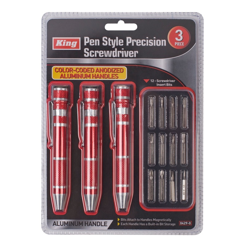 0429-0 - 3-PC PEN STYLE PRECISION SCREWDRIVER SET3-PC PEN STYLE PRECISION SCREWDRIVER SET- 12 Screwdriver insert bits- Bits attach to handles magnetically- Each handle has a built-in bit storage- Color-coded anodized aluminum handles- Aluminum handleUPC657
