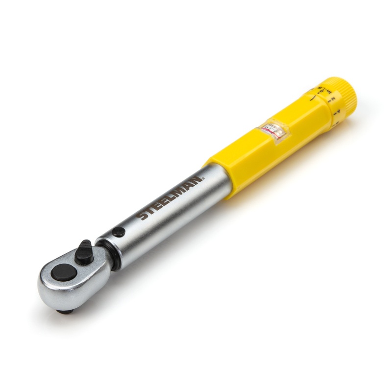 It’s not just the people working on the big projects that need to accurately torque fasteners and to help with those smaller precision jobs we offer the STEELMAN 96249 1/4-Inch Drive 30-150 in-lb Micro-Adjustable Torque Wrench with Hi Viz Handle. Ideal for smaller jobs like TPMS sensors, bicycles, motorcycles, and other small engines, this torque wrench will help you finish with the confidence that your repair job is as good as any factory or repair garage would do. Useable with any 1/4-inch drive socket, adapter, or extension and adjustable in increments of 2 in-lb in a range of 30 to 150 in-lb, this carbon steel tool will make a click that you can both hear and feel when you’ve reached the desired torque on the fastener. The reversible design allows the wrench to be used to drive fasteners in both directions, however it only measures torque when rotated in a clockwise direction. An inset viewing window in the handle lets you know at a glance what the current torque settings are and can be adjusted by rotating the dial on the base of the handle. The handle itself has a high visibility yellow PP plastic grip to help the tool stand out among similar looking ratchets in a crowded tool box. To prove our confidence that your torque wrench is ready to go, each STEELMAN torque wrench comes with a certificate of calibration.