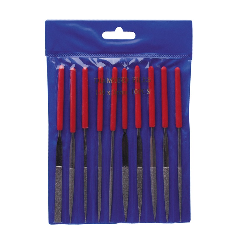 10 Piece Diamond Needle File Set - 5-1/2"Each 10 piece diamond needle files measure at 5-1/2" (140 mm) long. They are medium grit diamond electroplated onto high-grade steel. Includes: round, half-round, flat, three-square, square, warding, slitting, oval,