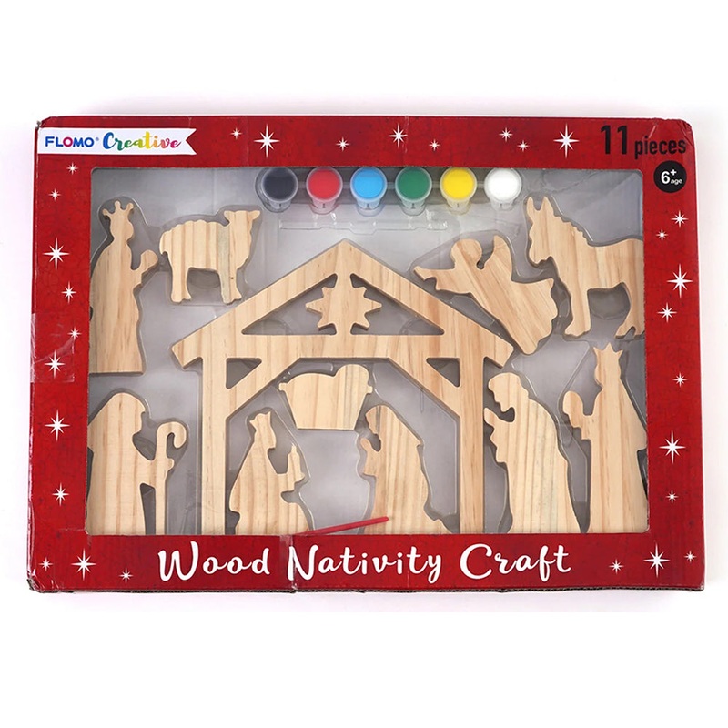 This 11-Piece Wood Nativity DIY Craft makes the perfect craft for the holidays! It comes with 11 wooden pieces that are ready to paint with the 6 included paints. The paints can be mixed to create additional colors. Makes the perfect Christmas gift for children who love arts and crafts projects!Includes: 10 wooden figurines, 1 wooden house, 6 (5ml) acrylic paint pots, 1 paint brushWashableNon-toxicAges 6+WARNING: Choking Hazard. Small parts. Not for children under 3 years.