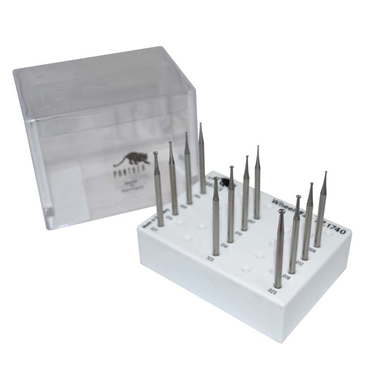 The Panther brand is made from hardened tool steel, and always individually inspected to assure the highest quality products. This set includes 12 burs, sizes: 0.60, 0.70, 0.80, 0.90, 1.0, 1.2, 1.4, 1.6, 1.8, 2.1, 2.3, and 2.5 mm, all mounted onto 3/32" sh