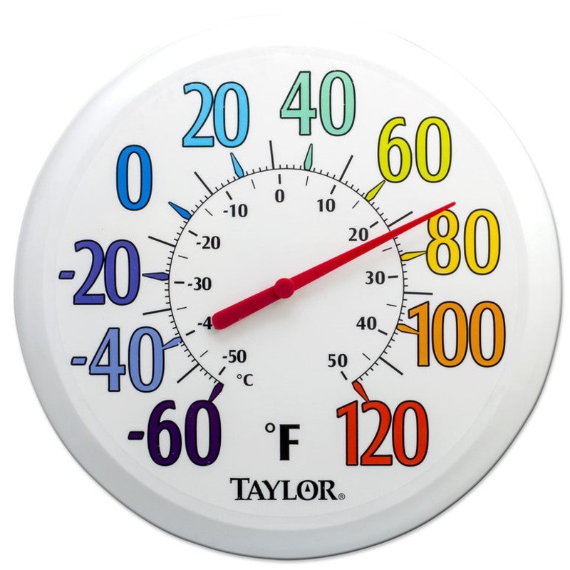 Always know what the temperature is with the 13.25 Inch Color Track Dial Thermometer 6714 from Taylor. Temperature range of -60 degrees F to 120 degrees F; made with sturdy, shatterproof materials. Bold, easy-to-read digits- framed in attractive white beze