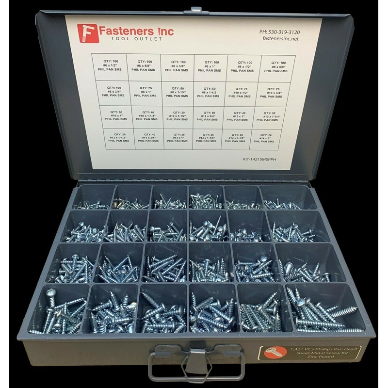 1421Pieces!Phillips Pan Head Sheet MetalSelf Tapping Screws#6, #8, #10, #12, #14 Diameters Included!Grey- Durham HD Steel Storage Box (Made in USA)Box Dimensions: 13-3/8"x9-1/4"x2"KIT SIZES/QUANTITIES INCLUDED:Phillips Pan Head Self Tapping Screws(100) #6x