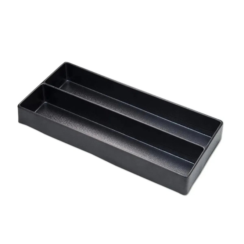 This plastic drawer divider features 2-equally sized compartments to keep smaller objects organized in drawers. The 1/3rd drawer size of this divider is designed to fit precisely in our toolboxes and tool cabinets along with our tools set in EVA foam tool