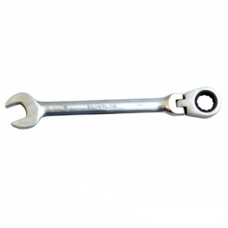 This 21mm Flexible Head Ratchet Spanner is manufactured by Silverline. This spanner is made from polished 40Cr alloy steel. Metric ratchet spanner. 8 ratchet action. 180 pivoting head.