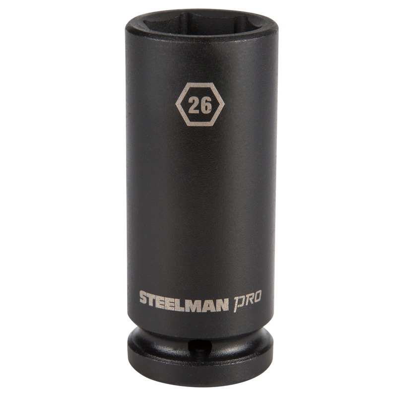 Every mechanic knows that having a reliable set of tools can make your life easier when working on heavy-duty vehicles and equipment. The STEELMAN PRO 79281 3/4-Inch Drive 6-Point 26mm Deep Impact Socket is ideal for use in performing maintenance, repairs and service on large trucks and tractor trailers, farming equipment and tractors, oilfield and construction equipment, and mass transit vehicles. Made from drop forged and heat treated chromoly steel, this socket features a ball detent recess on the 3/4-inch drive end to help hold it securely onto ratchets, air wrenches, adapters, and extensions. The 6-point shape grips the sides of fasteners and not the corners, reducing wear and the chance of rounding the fastener and the deep well design allows easy reach of nuts on extended threads and recessed bolts. The socket features a rust and corrosion resistant black phosphate protective coating with laser etched size callouts and markings. Rated to withstand up to 150% of ASME torque requirements for impact tools, this socket can handle tough use in any professional shop / garage, home workshop, or on the work site.