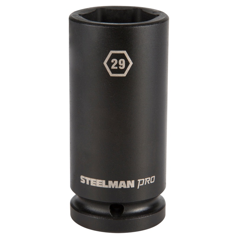 Every mechanic knows that having a reliable set of tools can make your life easier when working on heavy-duty vehicles and equipment. The STEELMAN PRO 79282 3/4-Inch Drive 6-Point 29mm Deep Impact Socket is ideal for use in performing maintenance, repairs and service on large trucks and tractor trailers, farming equipment and tractors, oilfield and construction equipment, and mass transit vehicles. Made from drop forged and heat treated chromoly steel, this socket features a ball detent recess on the 3/4-inch drive end to help hold it securely onto ratchets, air wrenches, adapters, and extensions. The 6-point shape grips the sides of fasteners and not the corners, reducing wear and the chance of rounding the fastener and the deep well design allows easy reach of nuts on extended threads and recessed bolts. The socket features a rust and corrosion resistant black phosphate protective coating with laser etched size callouts and markings. Rated to withstand up to 150% of ASME torque requirements for impact tools, this socket can handle tough use in any professional shop / garage, home workshop, or on the work site.