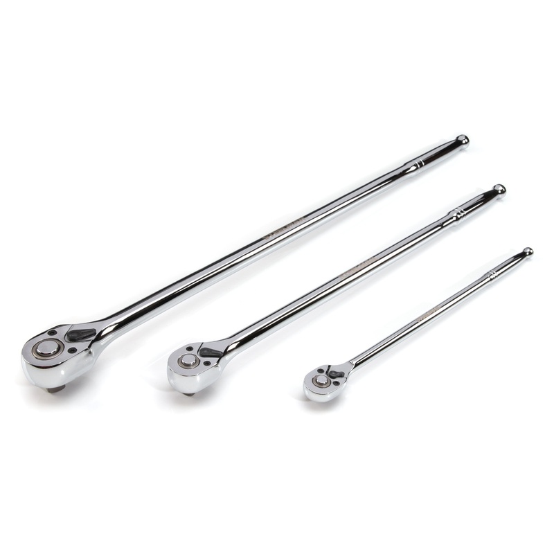Even the toughest of jobs are no match for the STEELMAN 61080 3-Piece Long Handle 72-Tooth Reversible Quick-Release Ratchet Set. This set includes one ratchet in 1/4-inch drive, one in 3/8-inch drive, and one in 1/2-inch drive. Each tool is constructed with a heavy-duty chrome vanadium steel handle and head to withstand the harshest of working environments. The 72-tooth ratcheting mechanism in each tool needs only a 5-degree swing arc to switch from tooth to tooth, making these ideal for use in tight or confined areas like vehicle engine compartments. In addition, each sports an extra-long handle to give you additional leverage on stubborn, rusty, or seized fasteners. The 1/4-inch drive ratchet measures 12-inches, the 3/8-inch measures 18-inches, and the /2-inch drive ratchet measures a full 24-inches in length. The back of each ratcheting head has a convenient quick-release button that allows you to swap out sockets easily. The full polish finish on each tool resists rust and corrosion and is easy to wipe clean when covered in oil, dirt, or grime. Designed to meet or exceed 150% of ASME and ANSI torque requirement standards for hand tools, these ratchets are a top choice for anybody in the automotive, construction or equipment maintenance industry!