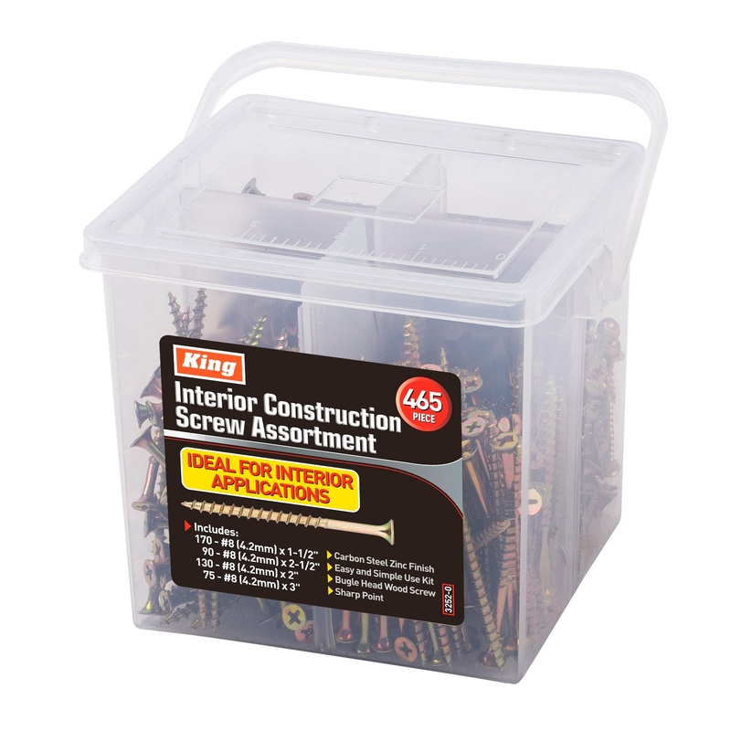 3252-0 - 465-PC INTERIOR CONSTRUCTION SCREW ASSORTMENT465-PC INTERIOR CONSTRUCTION SCREW ASSORTMENT- Ideal for interior applications- Comes with (170) #8 (4.2mm) x 1-1/2", (90) #8 (4.2mm) x 2-1/2", (130) #8 (4.2mm) x 2", and (75) 8" (4.2mm) x 3"- Carbon st