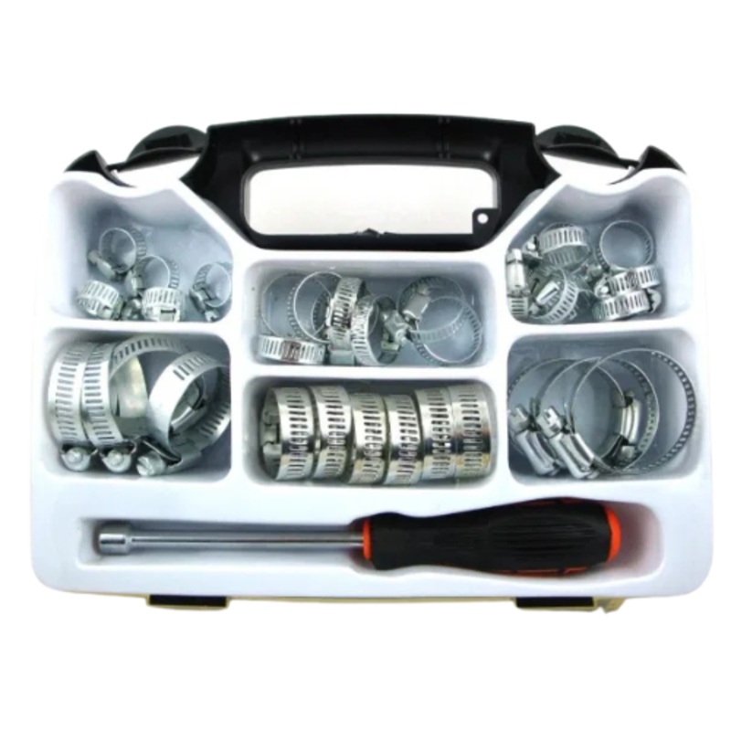 Set contained in a handy divided plastic case for storage and easy organisation. All hose clamp clips measure 0.6mm in thickness.