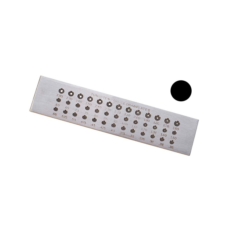Tungsten carbide inserts are permanently fixed in marked steel plates. The angle of reduction is made to exact specifications for the smoothest possible pull, features 39 hole sizes ranging from 2.80 mm to 0.26 mm.
