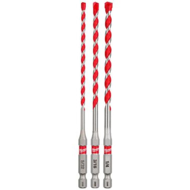 The MILWAUKEE 3-Piece SHOCKWAVE Carbide Hammer Drill Bit Kit uses sharpened carbide to deliver up to 5x longer life in concrete and up to 2x faster drilling into masonry material. Engineered with a precision ground tip, these bits deliver faster starts and less walking in concrete, brick, and block. The wide flute design removes dust faster, reducing heat and delivering more holes per charge. Milwaukee SHOCKWAVE Carbide Hammer Drill Bits have a 1/4″ Hex Shank for versatility and are compatible with both impacts and hammer drills. This drill bit kit includes (1) 5/32″, (1) 3/16″, and (1) 1/4″ bit.