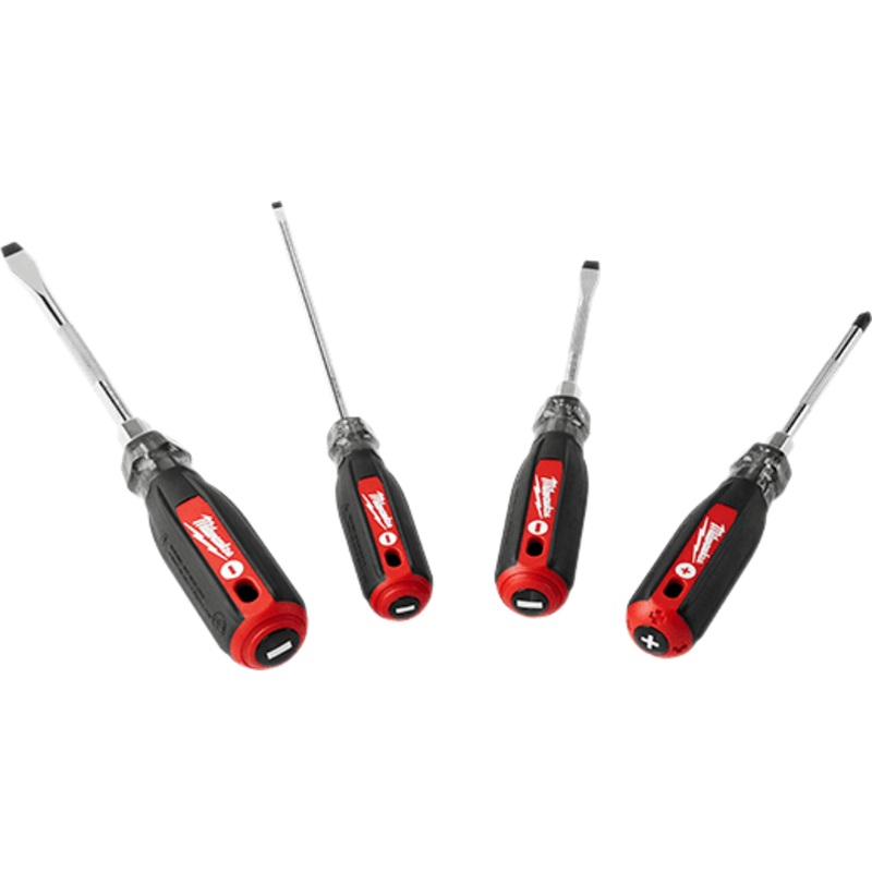 Featuring hardened tips & forged shanks the Milwaukee 4 piece cushion grip screwdriver set provides professional grade solutions and durability to the user. The wrench-ready bolster and precision knurling offers users the features needed to increase efficiency and effectiveness. The durable handles feature an anti-peel design.