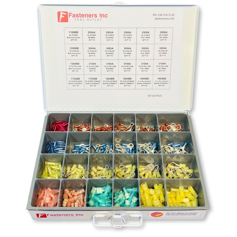 Box Dimensions: 13-3/8"x9-1/4"x2"CONTAINS:(50) RED BUTT(50) BLUE BUTT(25) YELLOW BUTT(25) RED MALE(25) RED FEMALE(25) BLUE MALE(25) BLUE FEMALE(25) RED MALE(25) RED FEMALE(15) RED #8 RING(15) RED #10 RING(15) RED 1/4 RING(15) RED 5/16 RING(15) RED 3/8 RING