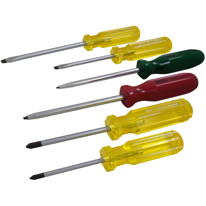 Contains:Slotted .035 X 1/4" Tip (4" Blade Length) & .042 X 5/16" Tip (6" Blade Length), Phillips #1 (3-1/4" Blade Length) & #2 (4" Blade Length) and Square Recess #: 1 (6-1/4" Blade) & # 2 (6-1/4" Blade length).High visibility, oil and solvent resistant a