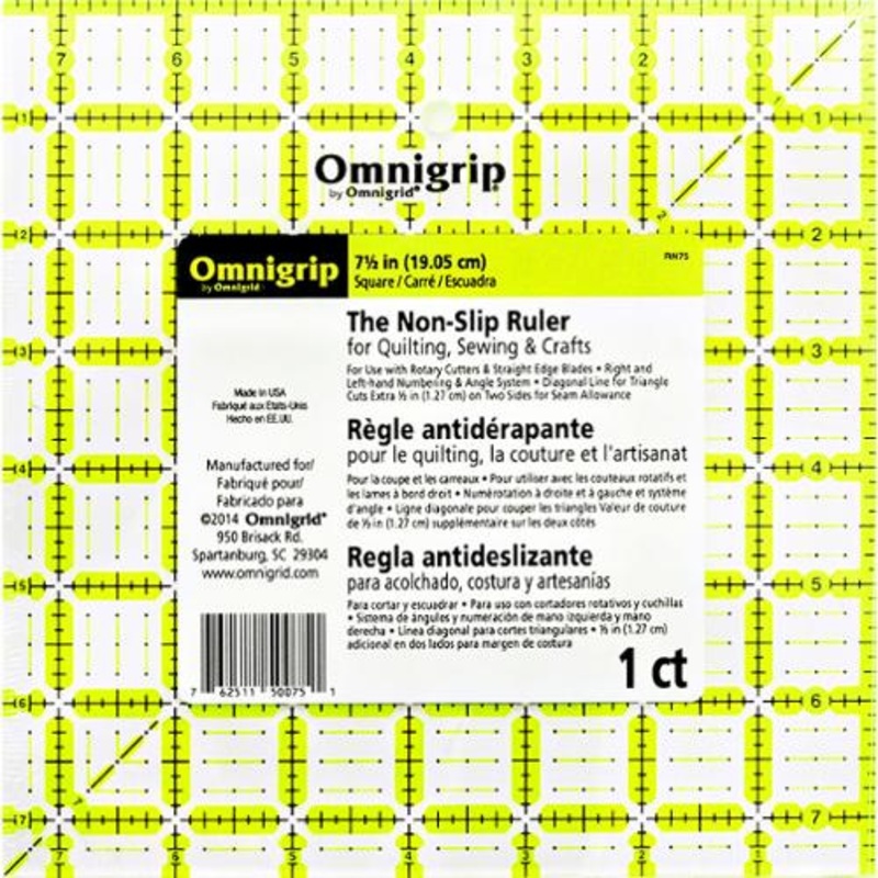 Make squaring up blocks simple with this 7.5″ Square Omnigrip Ruler RN75! This ruler is laser cut to within 0.002″ accuracy. It is compatible for both left and right hand users with double-sided lines. This ruler features 30, 45, and 60 degree angle markings.Made in USADimensions: 7.5 x 7.5 inchesMade of heavy-duty acrylicNon-slip