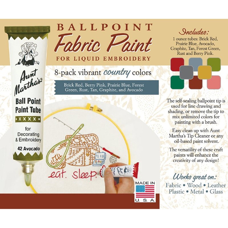 This pack of Country Ballpoint Fabric Paint is great for liquid embroidery, an alternative to stitching that mimics the look of natural embroidery on fabric. It is simple to use and saves time. The paint dries permanent and is machine washable. Great for use on fabric, paper, wood, and more!Country Colors: brick red, berry pink, prairie blue, forest green, rust, tan, graphite, and avocado1 ounce aluminum tubesSelf-sealing nylon ballpoint tipLead-freeNon-toxicPermanentWashable and dry-cleanableMade in the USA