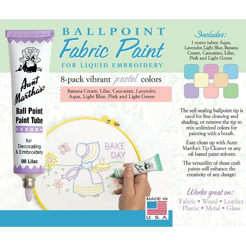 This pack of Pastel Ballpoint Fabric Paint is great for liquid embroidery, an alternative to stitching that mimics the look of natural embroidery on fabric. It is simple to use and saves time. The paint dries permanent and is machine washable. Great for use on fabric, paper, wood, and more!Country Colors: banana cream, lilac, Caucasian, lavender, aqua, light blue, pink, and light green1 ounce aluminum tubesSelf-sealing nylon ballpoint tipLead-freeNon-toxicPermanentWashable and dry-cleanableMade in the USA