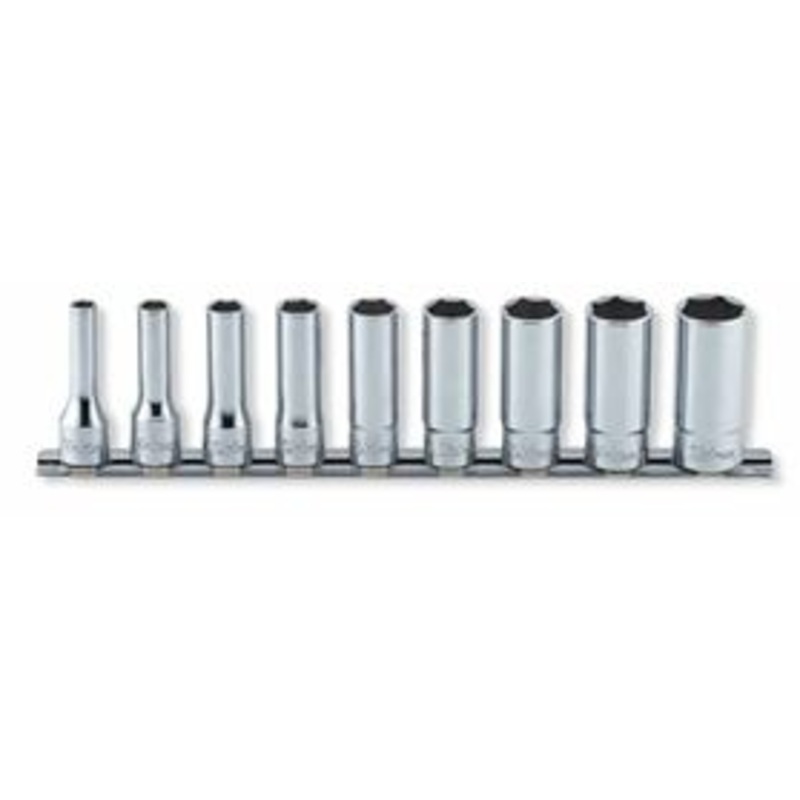 The Ko-ken RS3305A/9 is a 9-piece 3/8" square drive deep chrome socket set featuring 12-point openings. The set covers SAE sizes from 1/4" to 3/4", specifically 1/4", 5/16", 3/8", 7/16", 1/2", 9/16", 5/8", 11/16", and 3/4". Each deep socket is mounted on a
