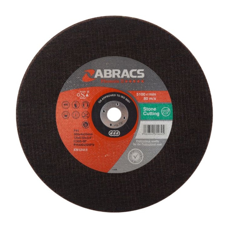 Abracs Phoenix II Stone Cutting Discs are a superior quality European manufactured range of cutting discs produced to O.S.A. Safety standards. Long life and high performance quick cutting with minimal effort required. These discs have been developed for ultimate performance smooth and consistent cutting stone. Suitable for use on a wide variety of stone cutting applications including Natural Stone, Concrete, Bricks & Tiles. European manufactured and produced to O.S.A safety standards. Suitable for use on an angle grinder.
