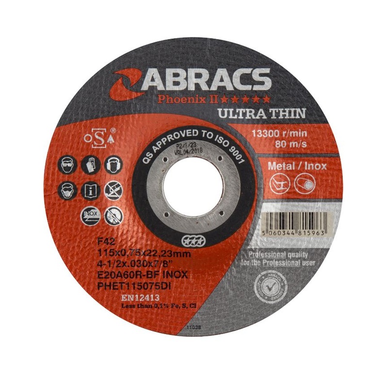 Abracs Phoenix II Extra Thin Cutting Discs are a superior quality European manufactured range of extra thin cutting discs produced to O.S.A. Safety standards. Extremely fast and precise cutting with minimal effort required. Phoenix discs have been develope