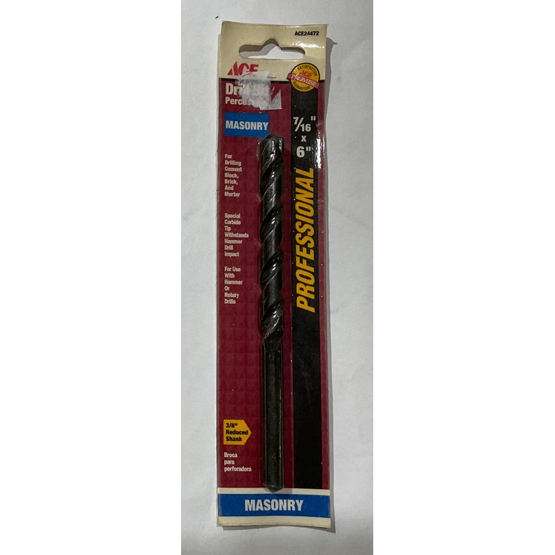 Ace 24472 7/16" x 6" Carbide tip Masonry Percussion drill bitFor drilling cement block, brick, and mortarSpecial Carbide tip withstands Hammer drill ImpactFor use with Hammer or Rotary drills3/8" reduced shank