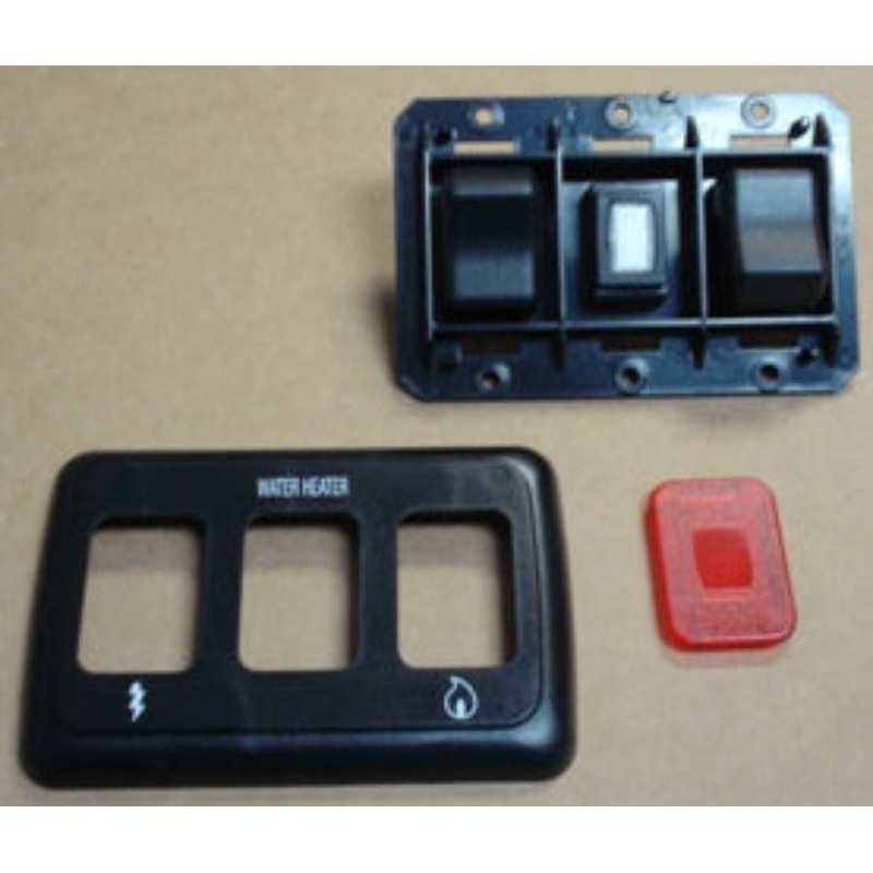 Airstream 3-Gang Water Heater Switch Assembly, Black – 512480-01 consists of bezel, 2 switches, and a center illumination for on/off indication.