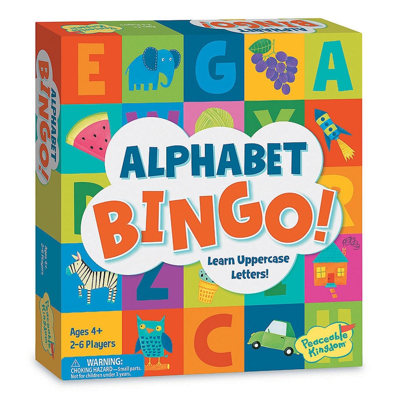 This fun and educational Alphabet Bingo Game puts a twist on the classic game of Bingo. Each player pulls a letter token out of the bag and places it on their board if they have a match. The instructions include 8 game variations to try. This game helps children to develop letter recognition skills.Includes: 6 game boards, 26 alphabet tokens, 72 chips, 1 game bag and instructionsAges 3+2-4 playersWARNING: Choking Hazard. Small parts. Not for children under 3 years.