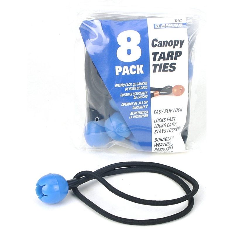 Ancra 95722 12" Bungy Canopy Tarp Ties 8-Pack,Product FeaturesEasy slip lockLocks fastLocks easyStays lockedDurable and weather resistant 12" cordsIf you have a question about one of our products, please email us. We check our email regularly, and try to g
