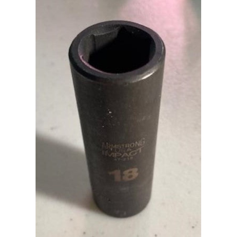 Armstrong 47-218 18mm 1/2" Drive 6 Point Deep Impact Socket USAThin wall design with precise fastener end dimensions meet industrial specifications.Radius corner design provides 1520Percent More Torque which extends fastener life and reduces slippage.Large