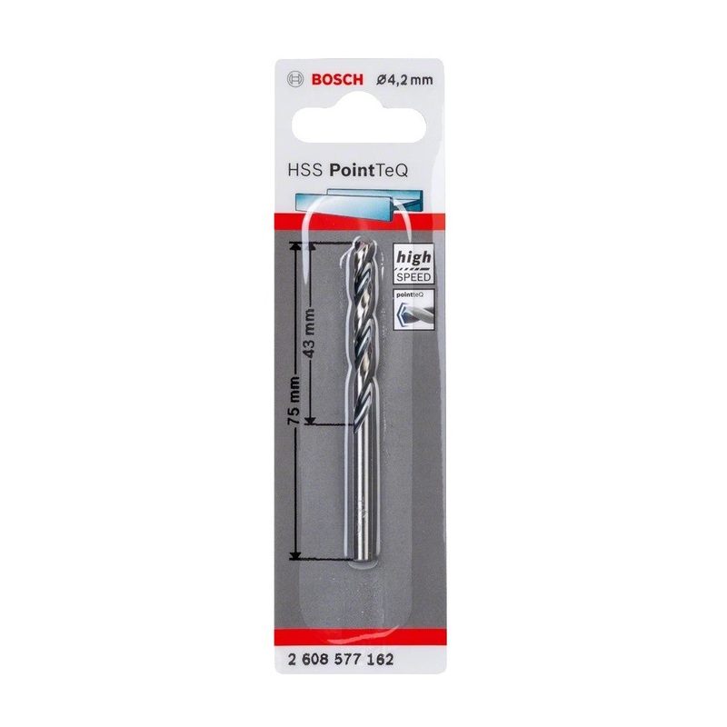 Bosch Drill Bit HSS PointTeQ 4,2mmThe Bosch 2608577162 is a HSS Metal Twist PointTeQ Drill Bit 4,2mm 1pk. The HSS Twist Drill Bit PointTeQ enables fast drilling in metal due to its PointTeQ tip design. Quick and easy drilling starts are possible as the sel