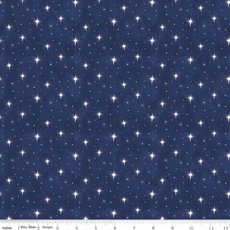 The Come Let Us Adore Him fabric collection celebrates the Christmas story with prints including the nativity scene, Christmas text, stars, and plaids in navy, wine, and off-white colors. Come Let Us Adore Him Stars Cotton Fabric C16314 features scattered