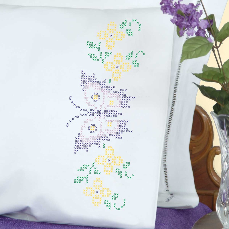 Cross-Stitch Butterfly Pillowcases 1600-347Cross-Stitch only designEach package contains one pair of standard-size pillowcases, with a finished edgeMade of poly/cotton broadclothAdditional materials needed to complete: hoop, needle, and flossFloss requirem