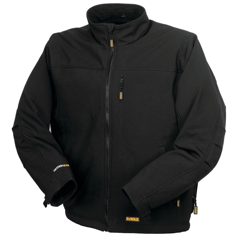 The Black Soft Shell Heated Work Jacket has 5 heating zones that are powered by a DEWALT 20V MAX* battery (included). The jacket has an LED controller with three temperature settings plus a pre-heat function. It is equipped with adjustable hook and loop cuffs and waist draw-cord to customize fit and help block wind. This jacket provides storage space with 2 zippered pockets, 1 external zippered accessory pocket, 1 internal zippered accessory pocket, and 1 internal accessory pocket with hook and loop closure. An added extension allows you to place the USB power adapter in front or back pocket.