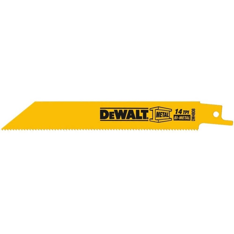 DEWALT DW4808 Metal Cutting 6" 14 TPI Straight Back Bi-Metal Reciprocating Saw Blade(5 Pk)Lasting up to 50% longer*, these Metal-Cutting Reciprocating Saw Blades feature a patented toothform that delivers fast, smooth cuts for a range of metal cutting appl