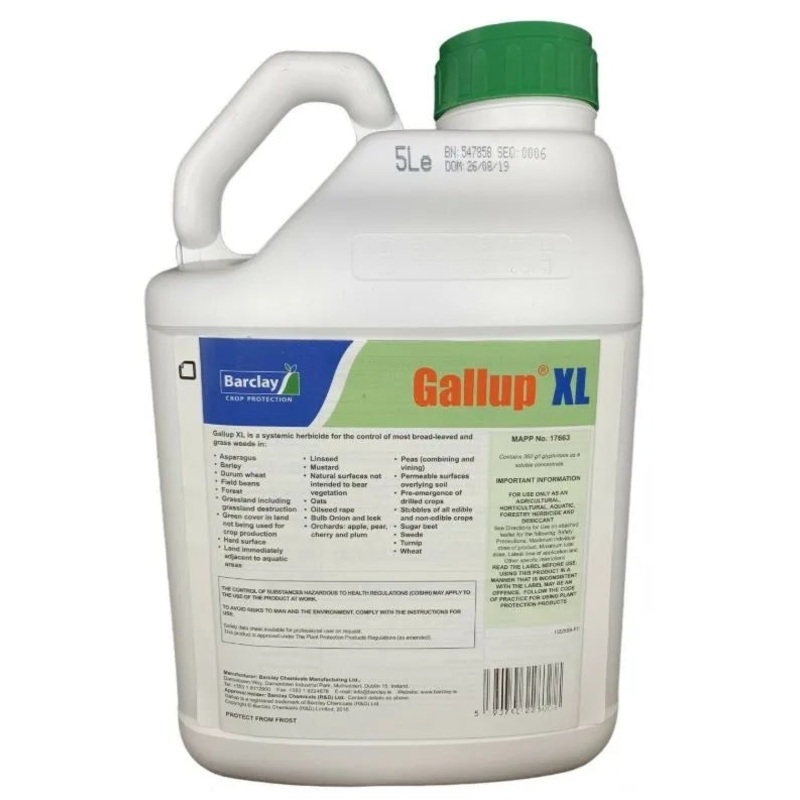 Gallup XL - 5 LitreTreats - 2.5 AcresMapp Number - 17663Gallup XLis a total weed killer. Once sprayed the active substance inGallup XLenters the plant and is translocated throughout the leaves, stem and root system where it blocks important chemical proces