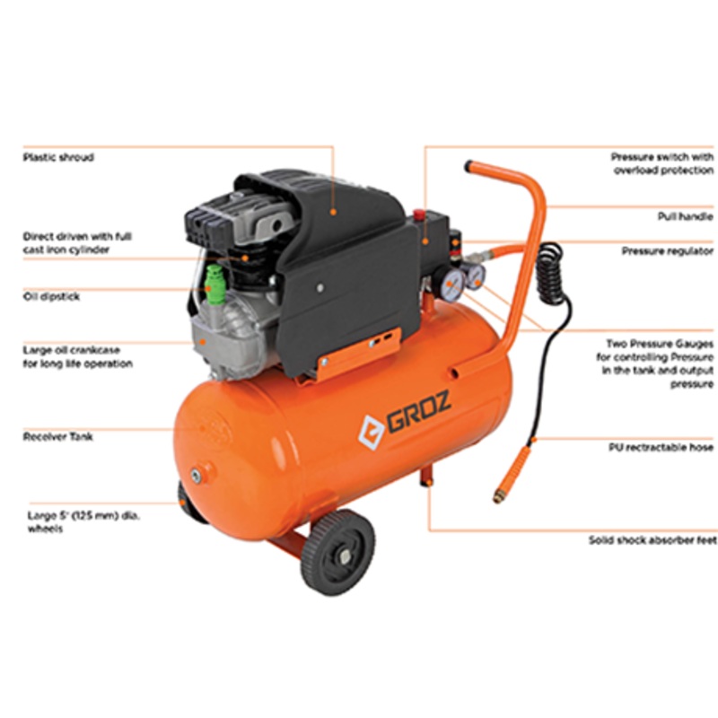 Description:Two pressure gauges, one for pressure setting in the receiver and one for regulating the outlet pressure from the receiver.Pressure switch with overload protection keeps the compressor safe even in voltage fluctuations.Oil dipstick with vent ho