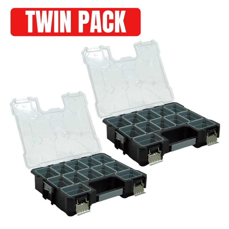 Jefferson 12 Compartment Professional Stackable Organiser (2 Pack) Hard plastic case with twelve plastic removable bins Fitted plastic handle Metal twin-toggle locking catches Ideal for storing a mixture of small and large fixings and components etc. Case