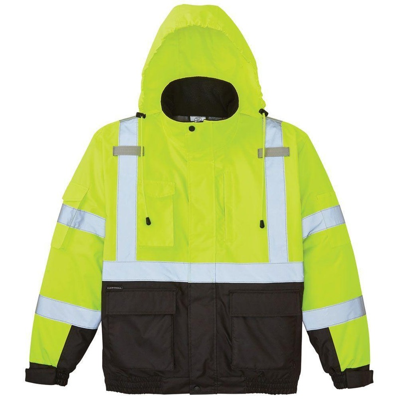 The High-Visibility Large Winter Bomber Jacket from Klein Tools is water and wind resistant with insulation for superior warmth. It features 10 pockets, attached inset hood, and zippered underarm vents. ANSI rated Type R, Class 3.