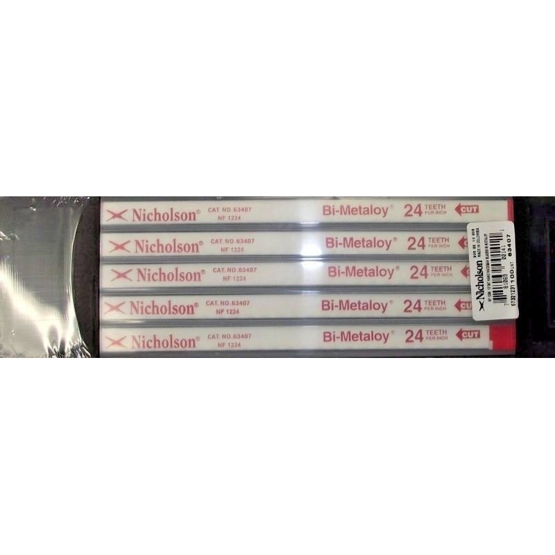 Nicholson 63407 Bi-Metaloy Hacksaw Blades Heavy Duty 12" x 24 Teeth 100pcs.Professional-use Heavy Duty blades for cutting nickel, high-carbon steel and other tough alloys quickly and cleanly.1/2" wide0.025" thick.24 teethSize: 12"aeronca 2AIf you are on ou