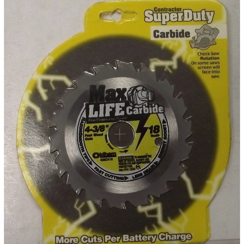 Oldham 438C418 4-3/8" x 18 Tooth Max life Carbide Saw Blade USAContractor super duty20mm arborCuts fast and clean micrograin tungsten carbideLess dragAnti-kick safety designIf you are on our eBay store, and are interested in more of our items, we do offer