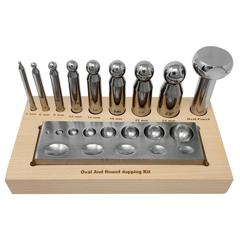 It features; 1 flat dapping block (165mm x 50.8mm x 25.4mm) with 8 half round and 5 oval concave profiles. 8 varying punches (3mm, 6mm, 9mm, 12mm, 15mm, 18mm, 21mm and 24mm) and 1 oval punch, all corresponding to the matching profile.