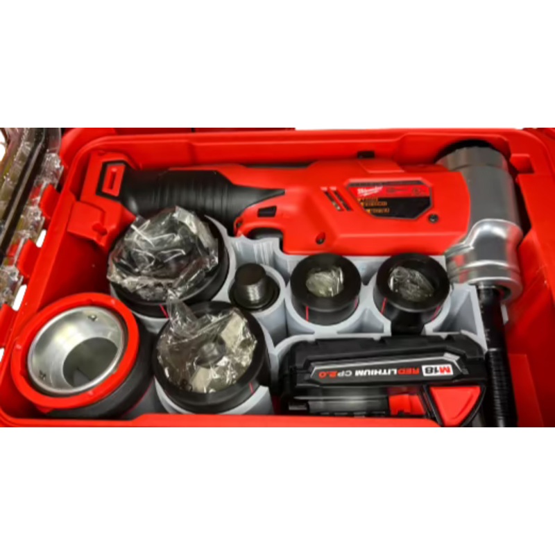 The first insert holds theknockout tool, 7/16″ draw stud, quick connect alignment system, 1/2″, 3/4″, 1″, 1 1/4″, 1 1/2″, and 2″ punches and dies, and 2.0 battery.
