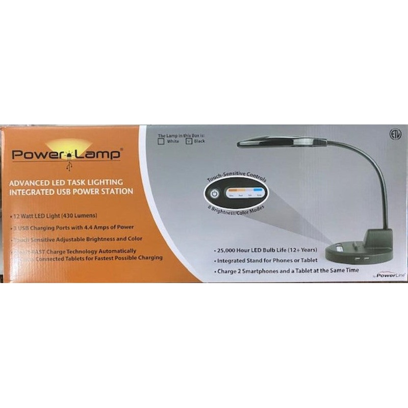 PowerLamp 90375 Advanced LED Task Lighting W/Integrated USB Power Station WhitePowerLamp is the ultimate LED desk lamp with USB charging ports from PowerLine.PowerLamp produces 430 Lumens of light, almost 3 times that of typical 5 watt LED lamps. In additi