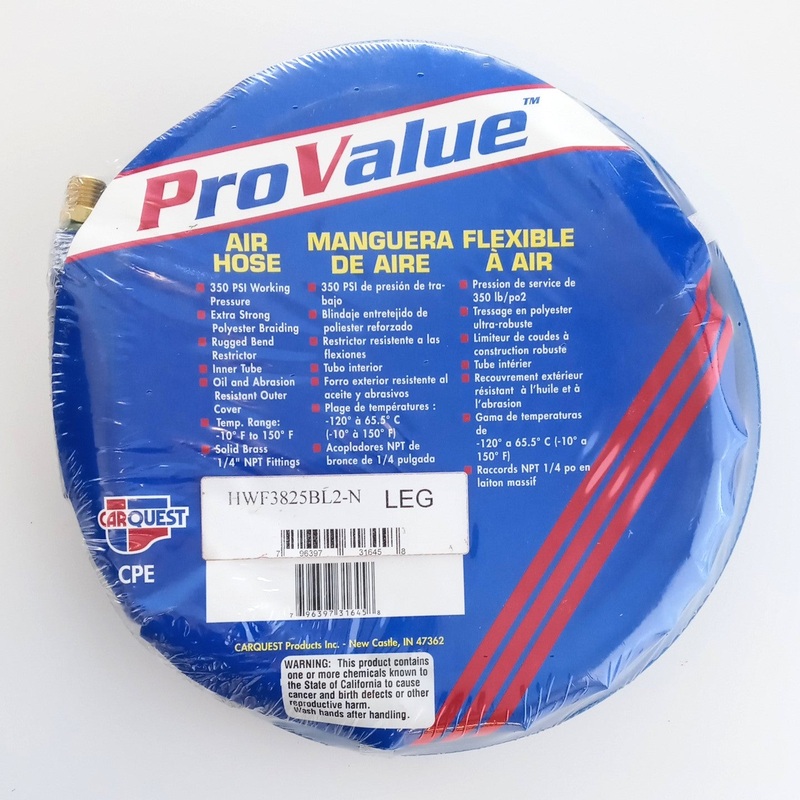 Pro Value HWF3825BL2-N 3/8" x 25 Foot Blue PVC Air Hose 1/4" Ends 350PSI Working350 PSI working pressureExtra strong polyester bradingRugged bend restrictorInner tubeOil and abrasion resistant outer coverTemp. Range -10 Degrees to 150 DegreesSolid brass 1/