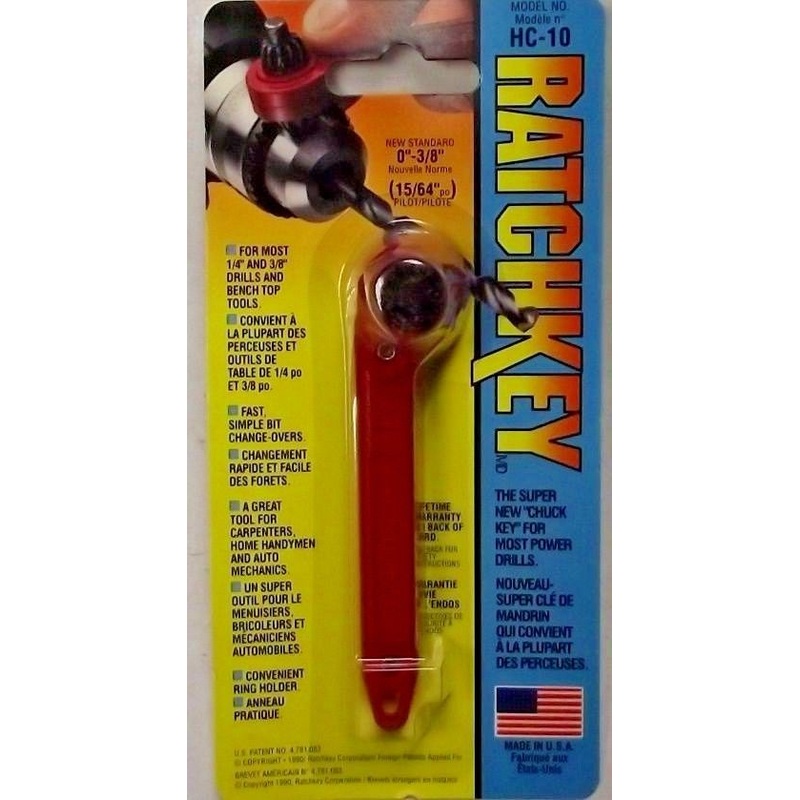 Ratchkey HC-10 0"-3/8" 15/64" Pilot Ratcheting Chuck Key USA Features Easy to use ratcheting chuck key. Will fit 95% of common Jacobs KG & KG1, Skil, Makita, B&D and other 0~3/8" chucks. High impact polymer handle. (polymer is a type ofPLASTIC) Ratchet in