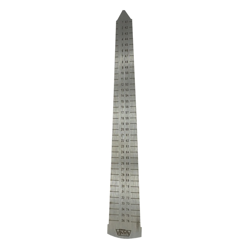 Ring Sizing Strip Gauge 1-36This ring strip gauge is used for measuring ring sizes. Double-sided, light weight and extremely durable.Sizes measured: 1-36, 41-76,13mm -24.2mm.Measures 6-1/2" in length.