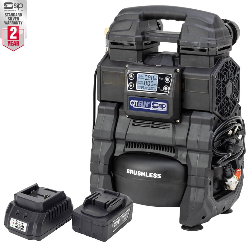 SIP 05313 5Ltr QT Oil Free Air Compressor (Battery/ Mains)Specification:Input Voltage: 18v 20v (DC) / 230v (AC)Motor Power: 500w (0.67hp)Pump Type: Oilless twin cylinderReceiver Size: 5ltrAir Displacement: 2.28CFM (65ltr/min)Battery Type: 20v 4Ah (AI01-004