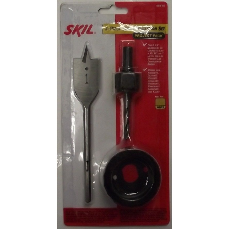 Skil 3pc Lock Installation Set 45715 For 2-1/2" Deadbolts or locksets with a 15/16" or 1" latch hole in wooden and composition doors Works with Kwikset, Dexter, Weiser, Schlage, Weslock, National, Sargent and Yale Includes: 2-1/8" holesaw, 1" spade bit and