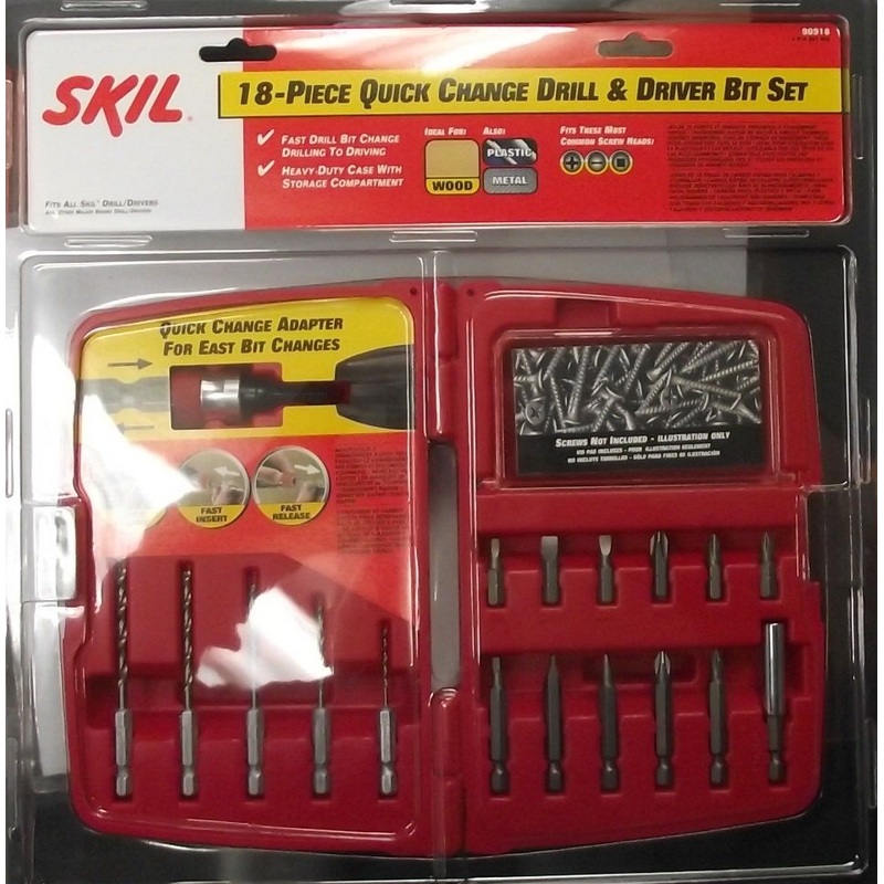 Skil 90918 18pc Quick Change Drill & Driver Bit Set Skil 90918 quick change d&d set (18 pc) features: multi-purpose drill bit sizes 1/16, 3/32, 7/64, 1/8 & 9/64 1 insert bits phillips: #1, #2 & #3 1 insert bits slotted 6-8, 8-10 1 insert bits square recess